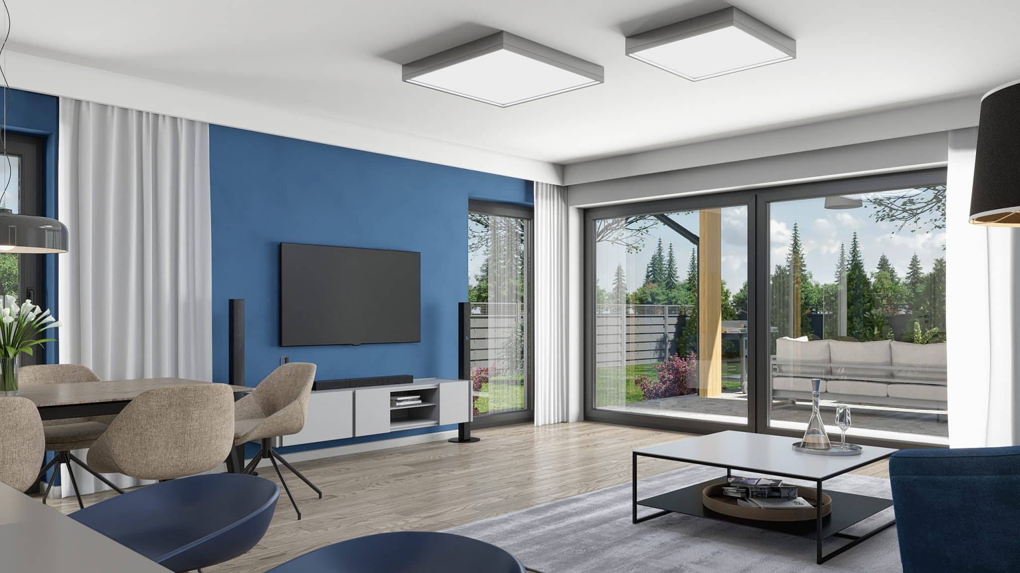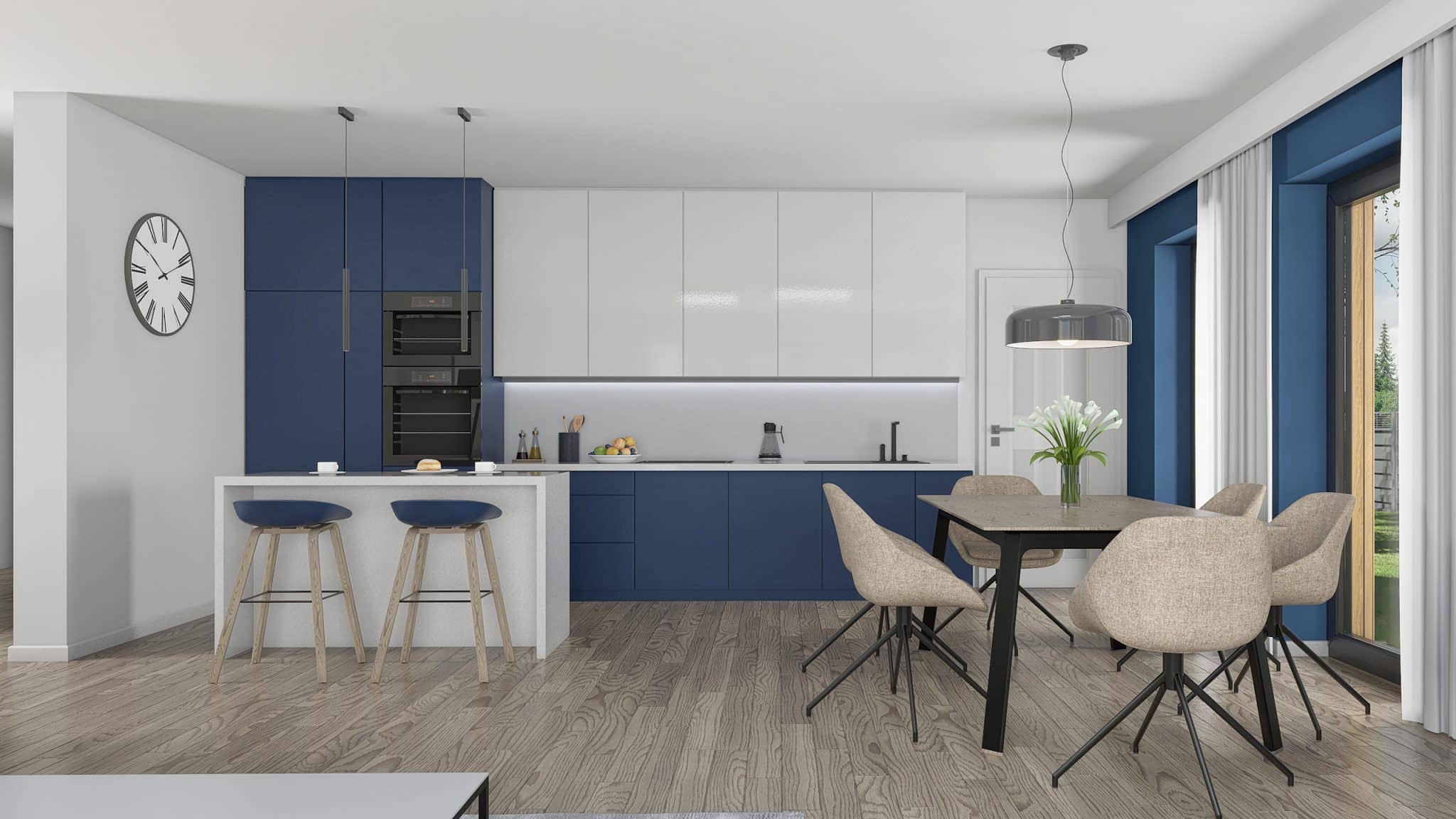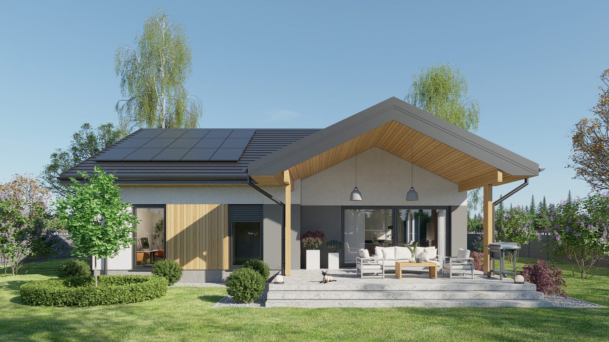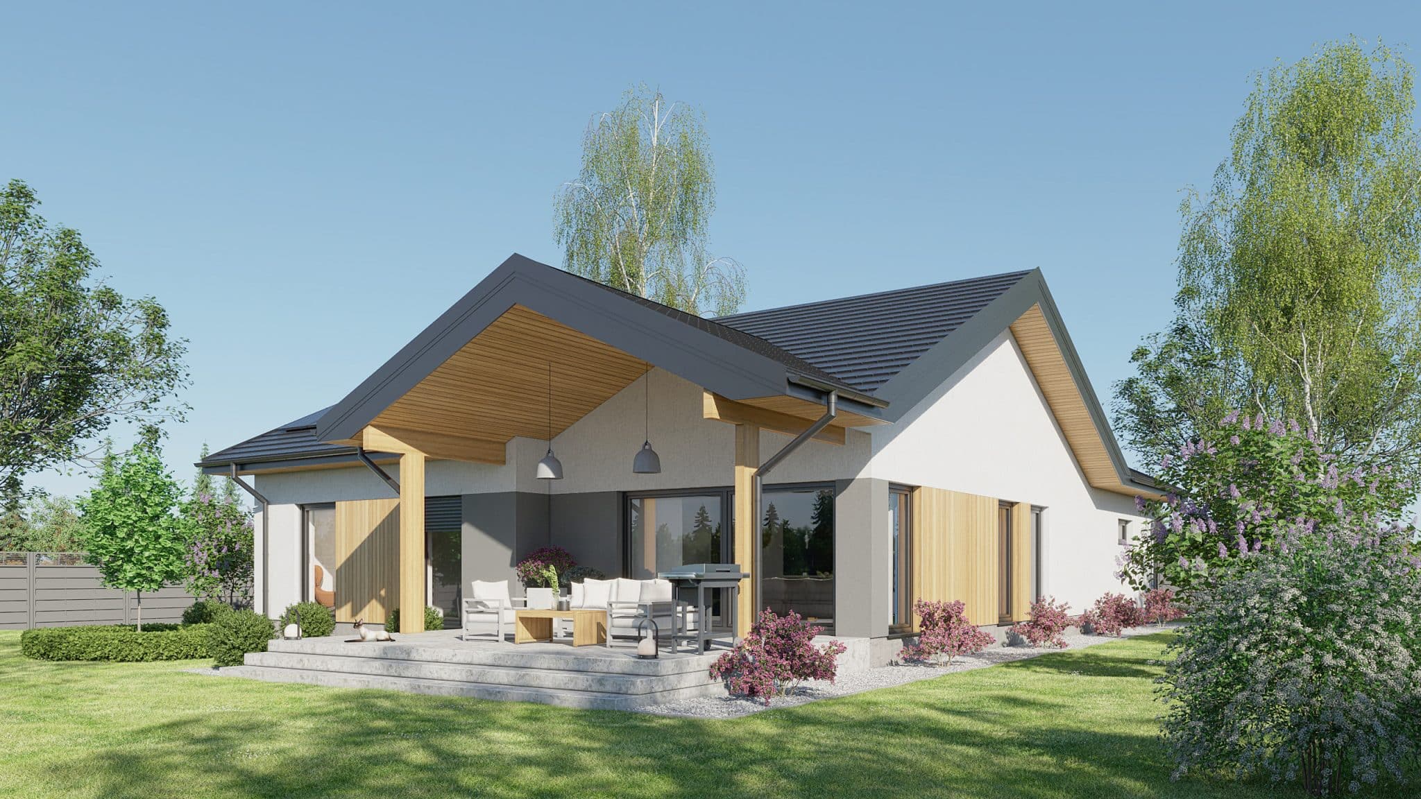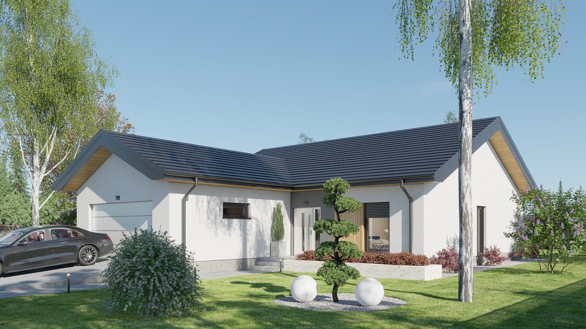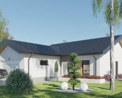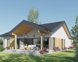 Projekt „Przystojniak” łączy nowoczesny design, funkcjonalność i wygodę. Idealny dla rodzin szukających przestrzeni i komfortu. Ten dom oferuje wszystko, czego potrzebujesz do szczęśliwego życia. Rozkład pomieszczeń został starannie przemyślany: przestronny przedsionek zapewnia wygodne przechowywanie odzieży i obuwia. Dwa pokoje są idealnymi miejscami na sypialnie dla dzieci lub gości, natomiast główna sypialnia oferuje przestrzeń i prywatność. Salon z aneksem kuchennym stanowi serce domu, gdzie można spędzać czas z rodziną i przyjaciółmi, ciesząc się wspólnymi posiłkami i relaksem. Praktyczna spiżarnia umożliwia przechowywanie zapasów i artykułów spożywczych. W domu znajdują się dwie łazienki: kompaktowa łazienka idealna dla gości oraz przestronna łazienka dla domowników, wyposażona w nowoczesne udogodnienia. Dodatkowo, funkcjonalne pomieszczenie gospodarcze, dwustanowiskowy garaż oraz przemyślany układ komunikacyjny zapewniają wygodę i płynność przemieszczania się po domu.