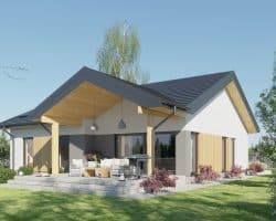 Projekt „Przystojniak” łączy nowoczesny design, funkcjonalność i wygodę. Idealny dla rodzin szukających przestrzeni i komfortu. Ten dom oferuje wszystko, czego potrzebujesz do szczęśliwego życia. Rozkład pomieszczeń został starannie przemyślany: przestronny przedsionek zapewnia wygodne przechowywanie odzieży i obuwia. Dwa pokoje są idealnymi miejscami na sypialnie dla dzieci lub gości, natomiast główna sypialnia oferuje przestrzeń i prywatność. Salon z aneksem kuchennym stanowi serce domu, gdzie można spędzać czas z rodziną i przyjaciółmi, ciesząc się wspólnymi posiłkami i relaksem. Praktyczna spiżarnia umożliwia przechowywanie zapasów i artykułów spożywczych. W domu znajdują się dwie łazienki: kompaktowa łazienka idealna dla gości oraz przestronna łazienka dla domowników, wyposażona w nowoczesne udogodnienia. Dodatkowo, funkcjonalne pomieszczenie gospodarcze oraz przemyślany układ komunikacyjny zapewniają wygodę i płynność przemieszczania się po domu.